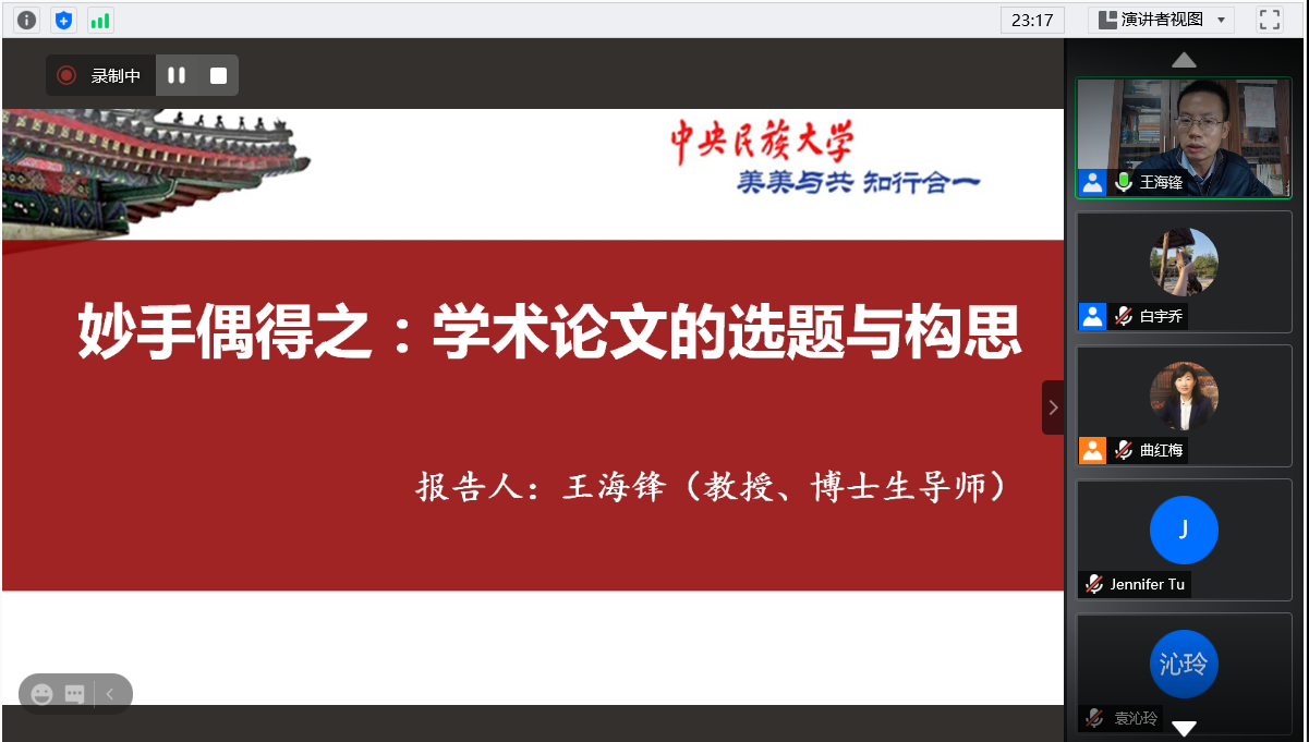 2020111018时,“2020年bv伟德国际1946官网学术教育提升工程”第八讲以腾讯会议的形式进行。此次讲座由bv伟德国际1946曲红梅教授主持,中央民族大学王海锋教授主讲。讲座的题目为《妙手偶得之:学术论文的选题与构思》。