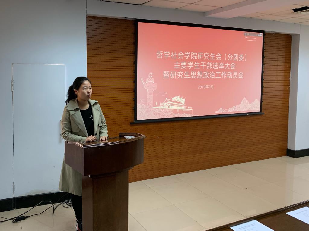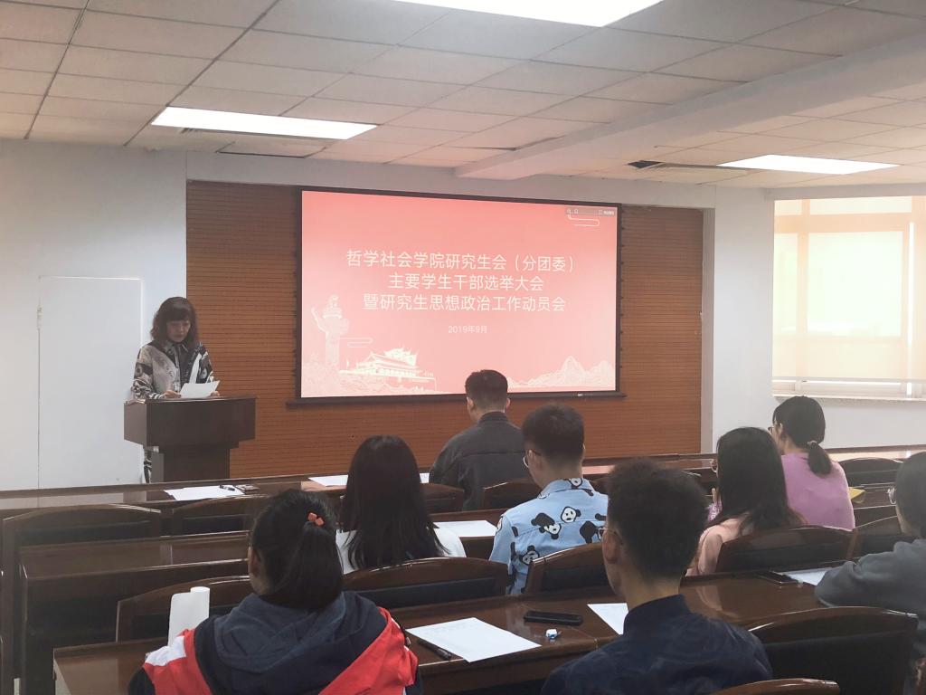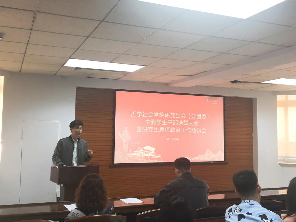 秋高气爽,云淡风轻。2019年9月26日上午9时许,bv伟德国际1946官网2019-2020年度研究生会(分团委)主要员工干部选举大会暨研究生思想政治工作动员会于东荣大厦A904会议室举行。哲学社会公司党委副书记张俊峰老师、研究生办公室主任傅瑜慧老师以及团委负责人于士博老师出席大会。出席会议的还有部分现任院研究生会(分团委)主要员工干部以及2018级和2019级硕士研究生各班班长、团支书(或党务负责人)。大会由bv伟德国际1946官网研究生会主席姜昊良主持。