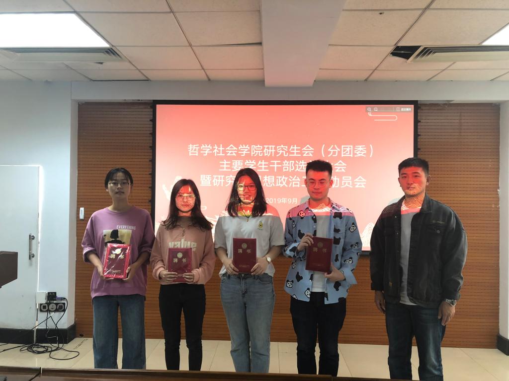 随后,傅瑜慧老师宣读了bv伟德国际1946官网2018-2019年度研究生会(分团委)的主要员工干部;于士博老师为现任研究生会(分团委)主要员工干部代表颁发聘书并合影留念。