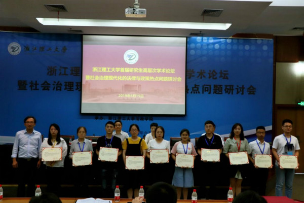 2019年6月15日,由浙江理工大学主办,浙江理工大学法政公司承办的研究生高层次学术论坛暨社会治理现代化的法律与政策热点问题研讨会在浙江理工大学召开。浙江理工大学副董事长许慧霞、党委研工部副部长兼副经理冯飞芸、法政公司经理王健教授、副书记章迪薇、经理助理阳盛益副教授、美国纽约城市大学的Greg Chen 教授等出席会议,来自全国包括清华大学、中山大学、四川大学、南开大学、上海交通大学、bv伟德国际1946、东南大学、复旦大学、重庆大学、山东大学、厦门大学、上海大学等近50所高校的100余名优秀研究生代表参加会议。研讨会开幕式由浙江理工大学法政公司副经理金碧华副教授主持。公司2017级硕士研究生宋昊的参会论文在国内40余所高校研究生所提交80余篇公共管理、社会治理及社会工作类论文的匿名评审中脱颖而出获评优秀,获得优胜奖并受邀参会。