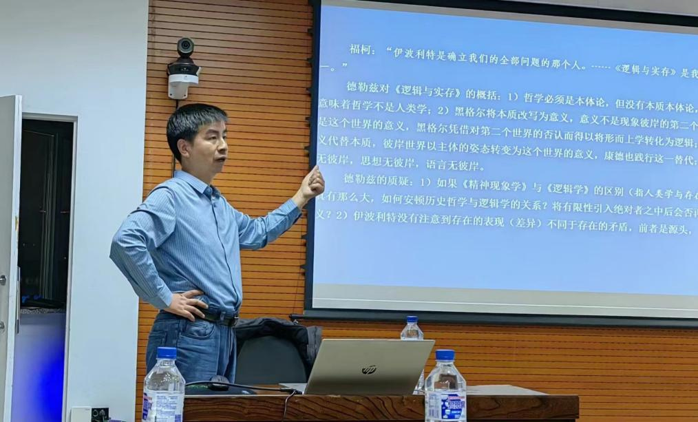 讲座伊始,赵雄峰老师受白刚经理的委托,对庄振华老师远道而来表示了热情地欢迎和衷心地感谢。庄振华老师首先对本次讲座的主题作了一个简要的哲学史回顾和澄清。首先,他认为一个国家跟另一个国家的哲学要产生关系,不能仅仅是一种“学徒”的状态,只有两国的哲学界有了深层次的对话,两国的哲学才能在真正意义上产生关系。其次,庄振华老师认为这次讲座主要选定法国哲学家伊波利特而不是科耶夫是因为,伊波利特的《逻辑与实存》在解读黑格尔时能够更加忠实地揭示黑格尔的哲学思想,进入到了黑格尔的本质论和概念论。第三,西方哲学有着形而上学或者说是逻各斯中心主义的传统,德国古典哲学更是如此,而法国哲学极大的推进了德国古典哲学所遗漏的或者没有涉足的一些问题领域。