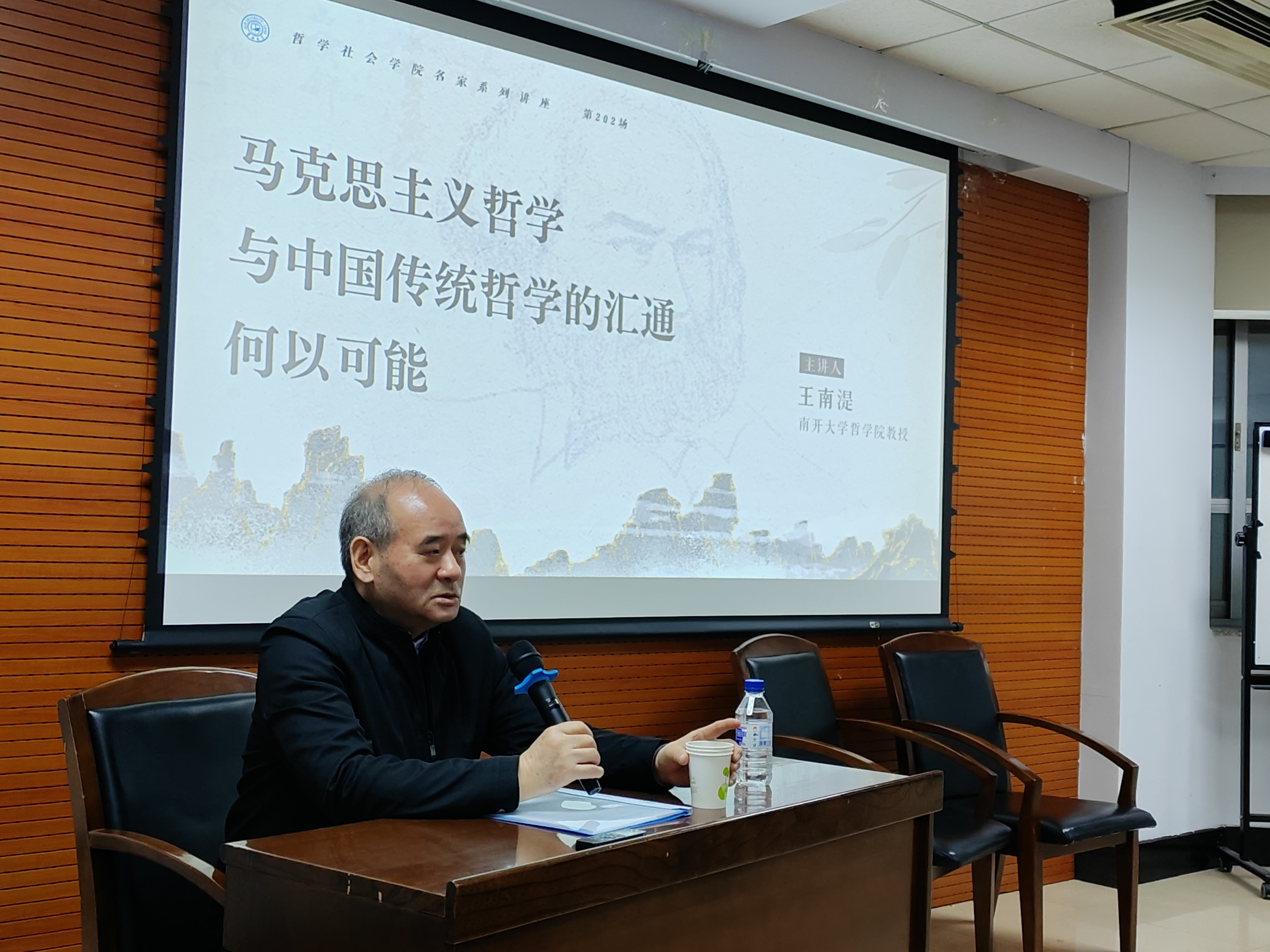 接下来,王南湜教授以“马克思主义哲学与中国传统哲学的汇通何以可能”为主题展开了本场讲座。王南湜教授认为,马克思主义哲学与中国传统哲学的汇通何以可能的问题,实质就是二者之间的高度契合性何以可能的问题,这种契合性并不是指在形式上将二者之间的相似性予以简单罗列,由于马克思的哲学是西方历史文化的产物,对马克思主义哲学与中国传统哲学高度契合性何以可能的探讨,应当建立在理解西方传统哲学与中国传统哲学根本差异的基础之上。中西哲学的根本差异在于呈现出了两种不同的本体论,中国哲学是天人一体的本体观,而西方哲学的本体观则将理念或上帝设定为超越性存在的本原之物。在此意义上,虽然马克思的哲学诞生于西方历史文化的背景之中,但马克思却以“人是对象性活动”的本体论基本原理,消解了超越性存在物的本体与现实世界中现象之间的二元矛盾。鉴于此,较之中国哲学中的天人一体的本体观同样否认了超越性本体的存在,马克思的“人是对象性活动”的本体观便同中国传统哲学的致思取向具有内在的契合性。