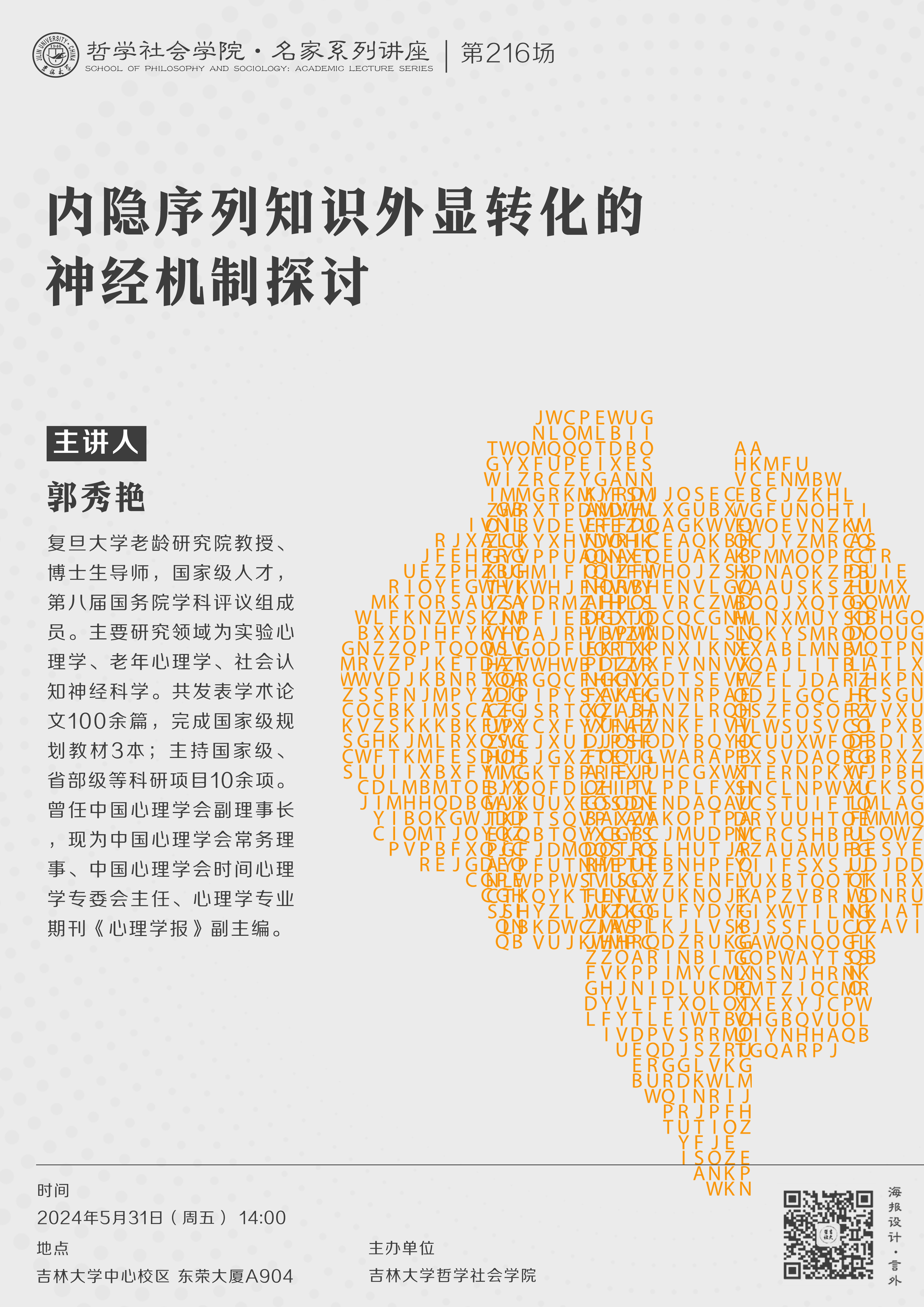 2024年5月31日,bv伟德国际1946官网名家系列讲座第216场于吉大中心校区东荣大厦904举办。讲座由复旦大学老龄研究院教授郭秀艳主讲,题目为“内隐序列知识外显转化的神经机制探讨”。bv伟德国际1946官网心理学系张彦彦教授主持,金庆英副教授、高玉林副教授、刘博副教授等四十余位来自哲学和心理学系的教师和员工参加了本次讲座。