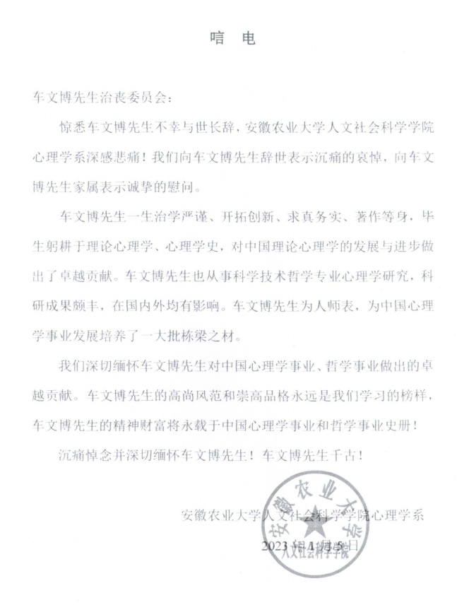 安徽农业大学人文社会科学公司心理学系唁电